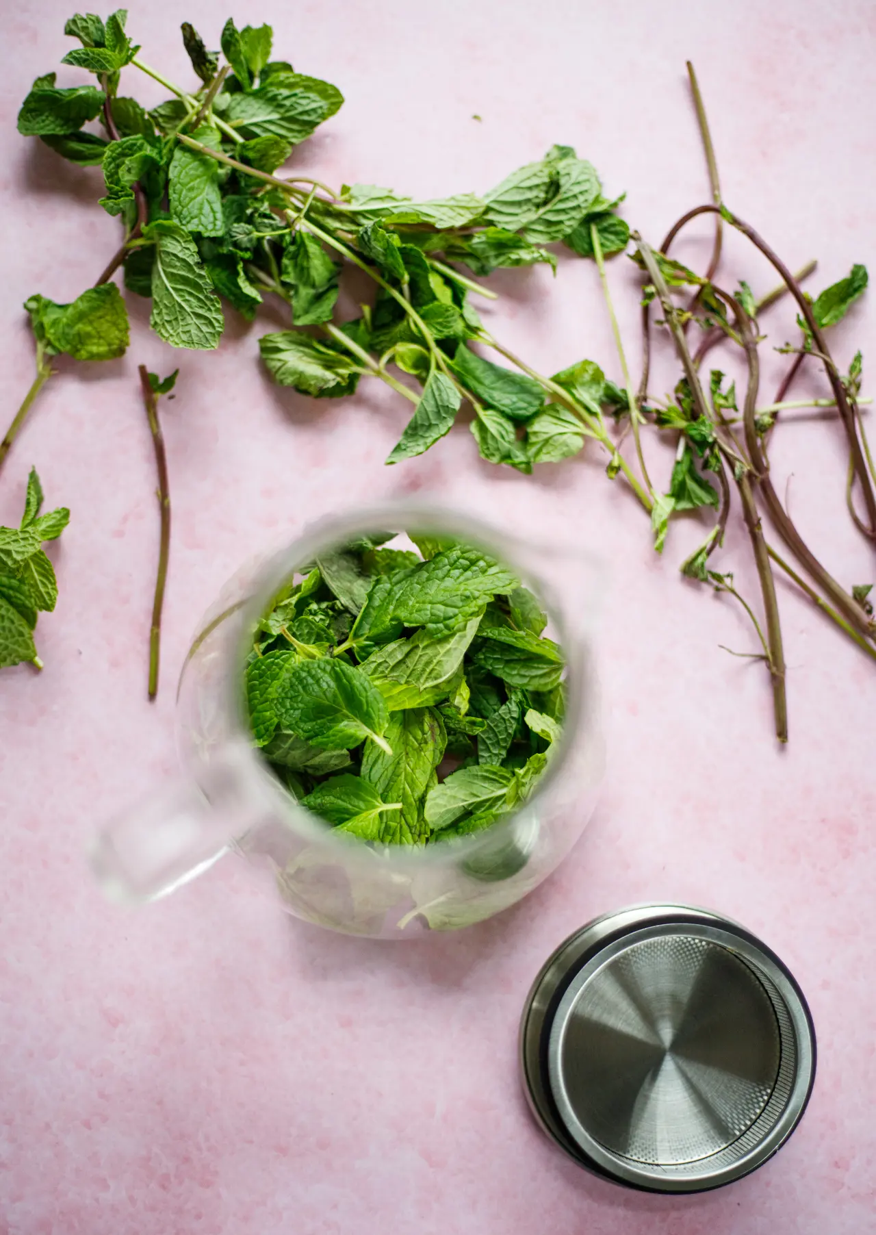 My teapot has a strainer built into the top, so I add the loose mint leaves and pour the water over it and let it sit for a bit. You can also use a french press if you have one. Or a regular teapot works as well, especially if it has a narrow spout to prevent the leaves from escaping.