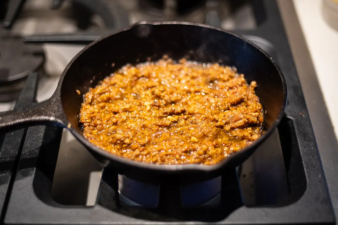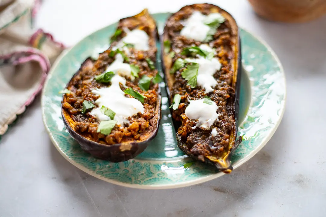 This is a plant-powered recipe with a filling that is similar to the ingredients I use to make cauliflower bolognese. While the eggplant is roasting, I combine cauliflower rice, tomatoes, walnuts, lentils, and a carrot and simmer for about 15 minutes. For omnivores, you can use your favorite protein, combine it with the garlic and onion, and leave out the carrots, walnuts, lentils, and cauliflower rice.