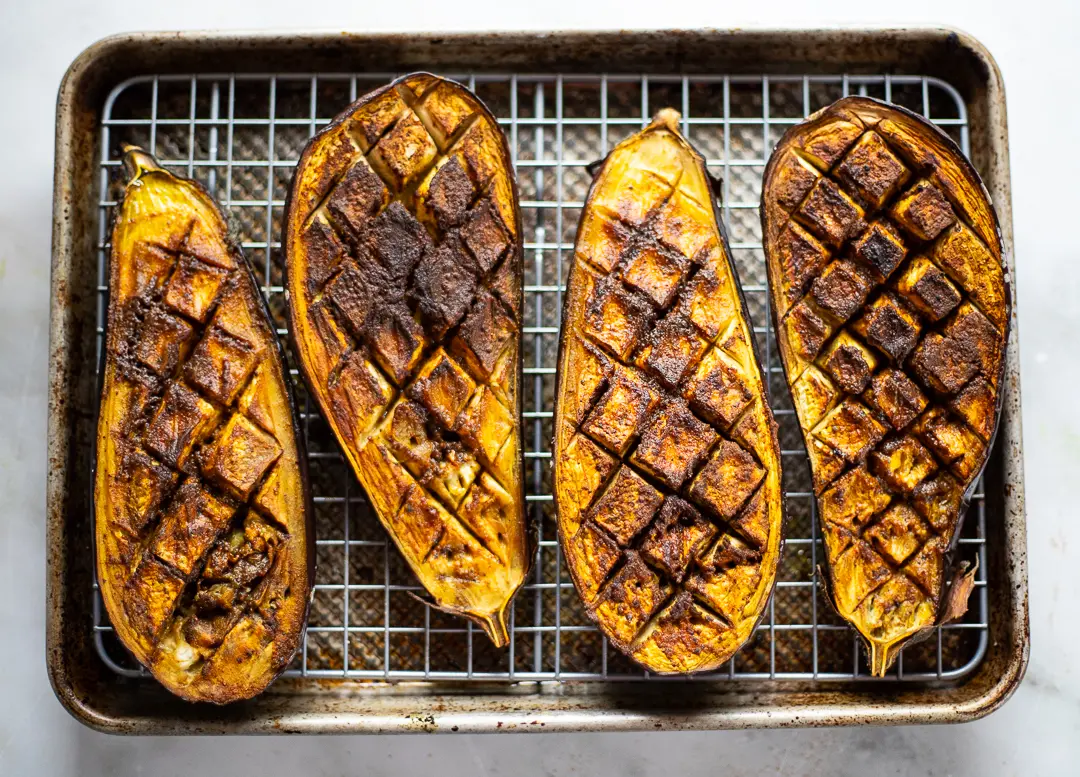 The photos show the eggplants roasting on the rack of the baking sheet, however you can bake them on parchment paper or other surface. And actually the eggplants bake better on parchment paper because they can reabsorb any olive oil or juices expressed during the roasting.